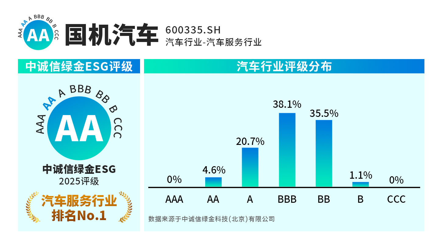 近日,國(guó)機(jī)汽車股份有限公司(證券代碼:600335.SH),榮獲所在行業(yè)中誠(chéng)信綠金ESG最高評(píng)級(jí)AA,躋身上市公司前4%行列,彰顯公司在環(huán)境、社會(huì)和治理(ESG)領(lǐng)域的卓越表現(xiàn)與顯著進(jìn)步。中誠(chéng)信綠金是中國(guó)領(lǐng)先的ESG評(píng)級(jí)機(jī)構(gòu),構(gòu)建了一套深度融合本土實(shí)踐與國(guó)際規(guī)范的評(píng)級(jí)體系,其將A...